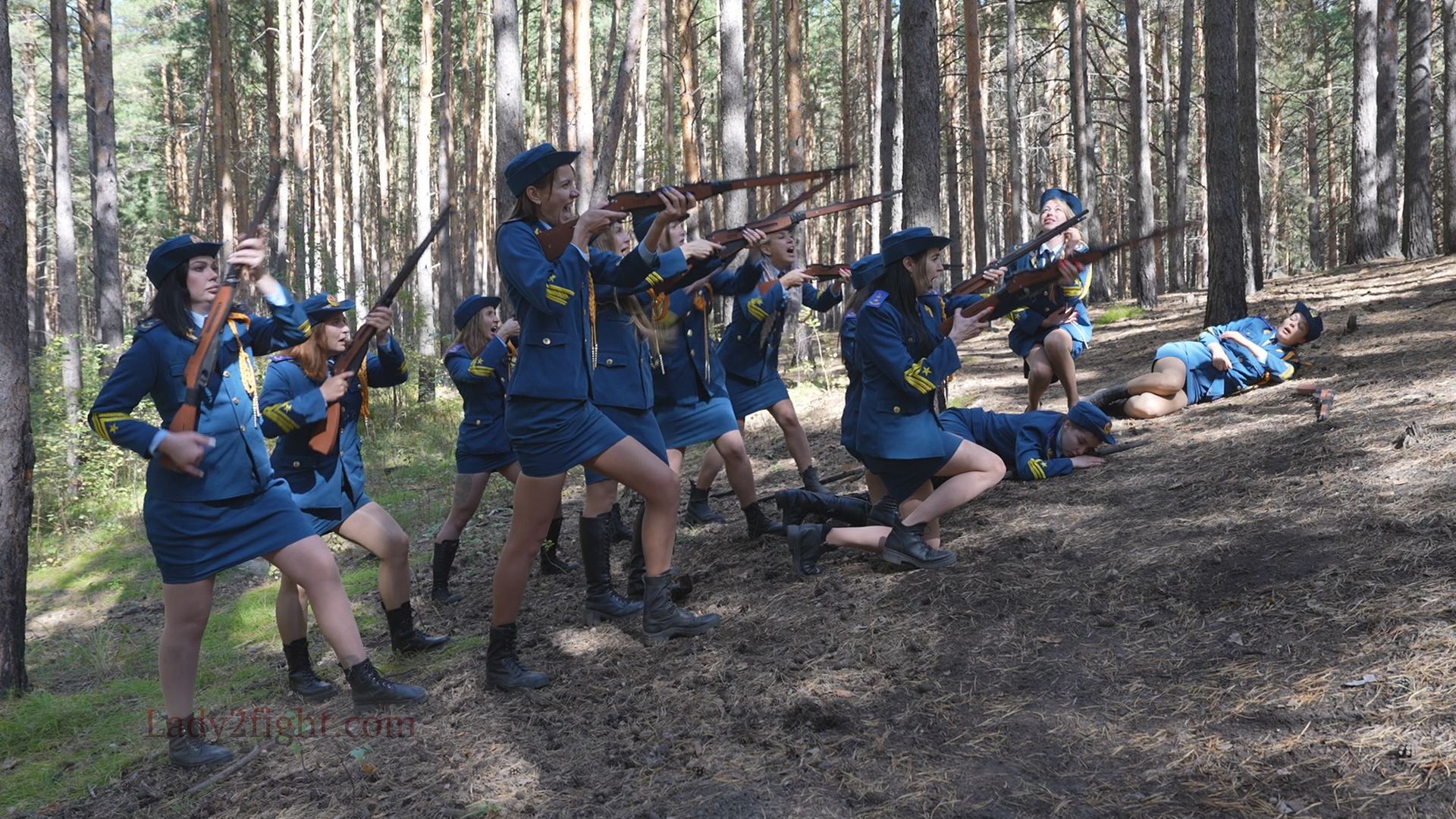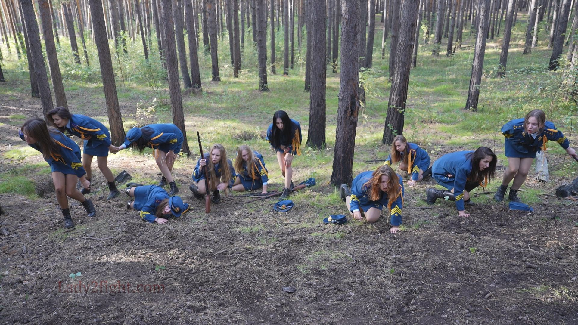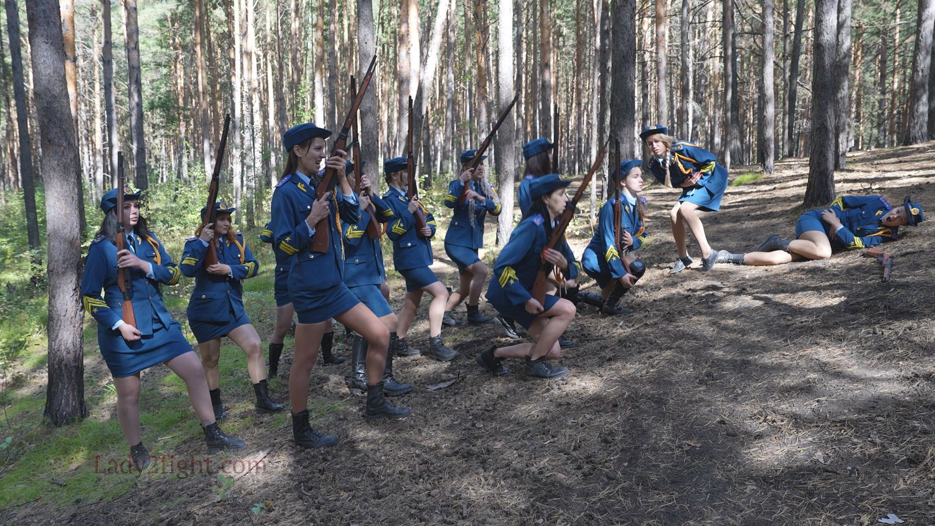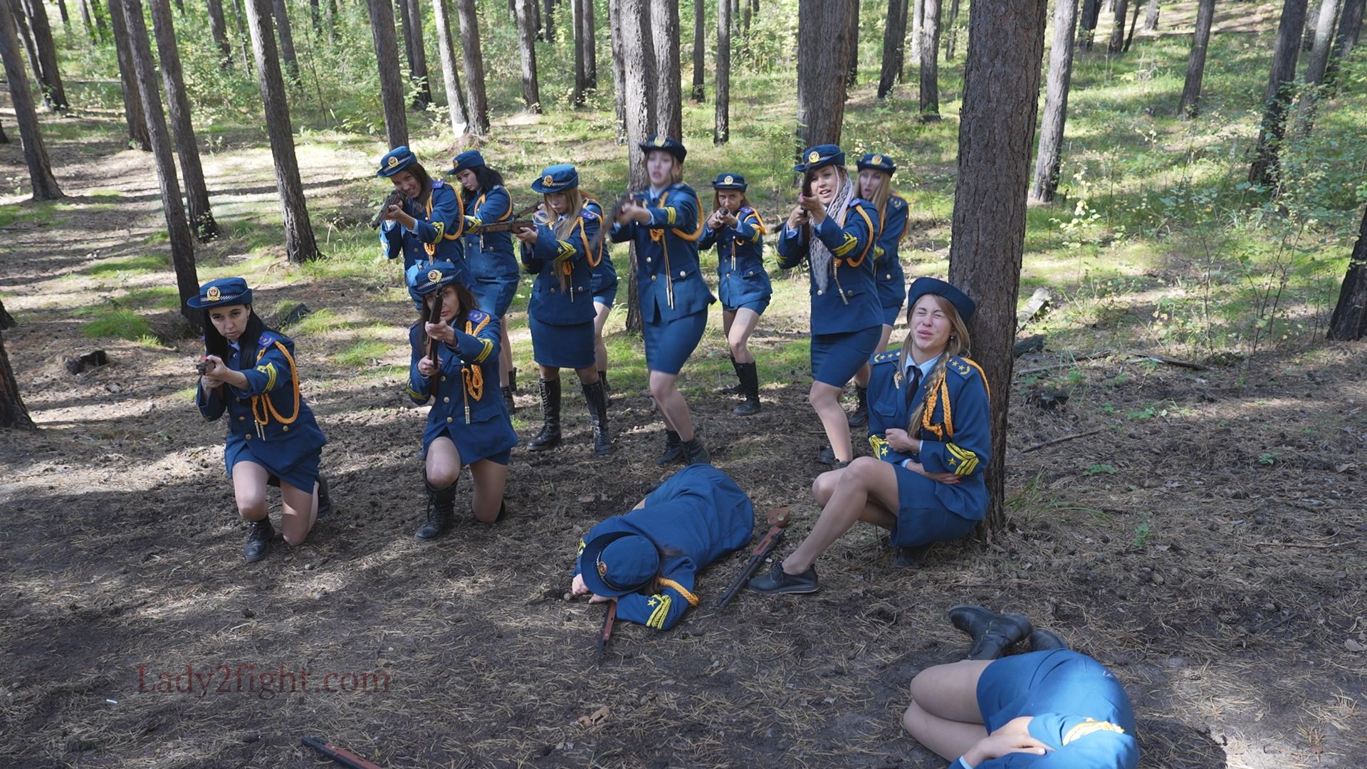 Lora, Luna, Michelle, and their fellow women soldiers march with pride—unaware they’re being led into a deadly trap. Outnumbered and outmatched, the squad faces a brutal ambush where every shot and strike is aimed at their stomachs. One by one, the women fall to relentless melee attacks, their courage crushed beneath the enemy’s strength. With no reinforcements to save them, the brave troops are left broken and defeated, their army wiped out in a devastating rout. The video is divided into several battle stories, with one scene recreating the Mohicans ambush shot-for-shot.